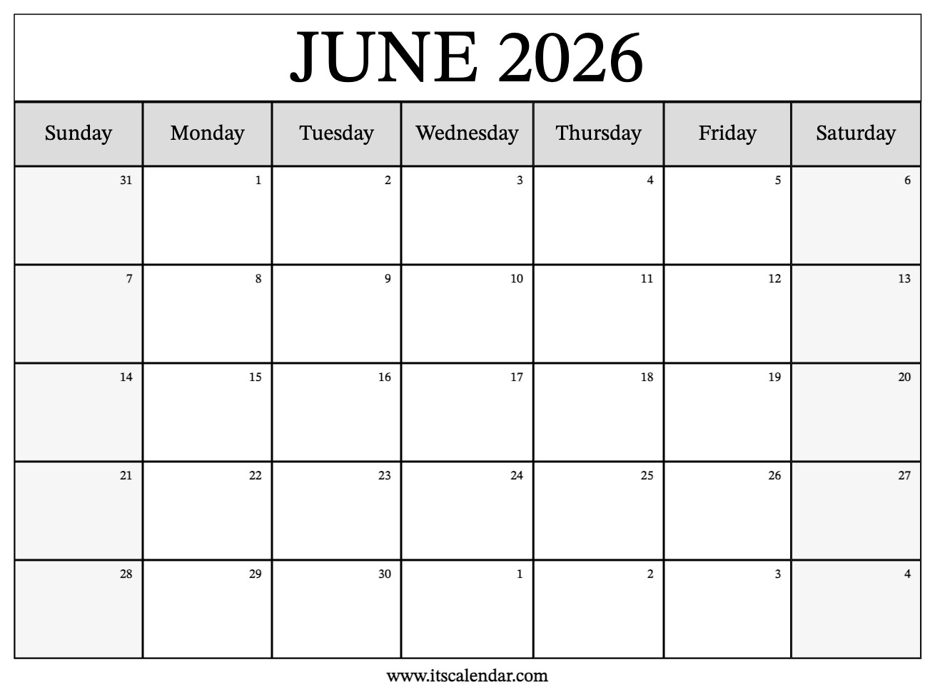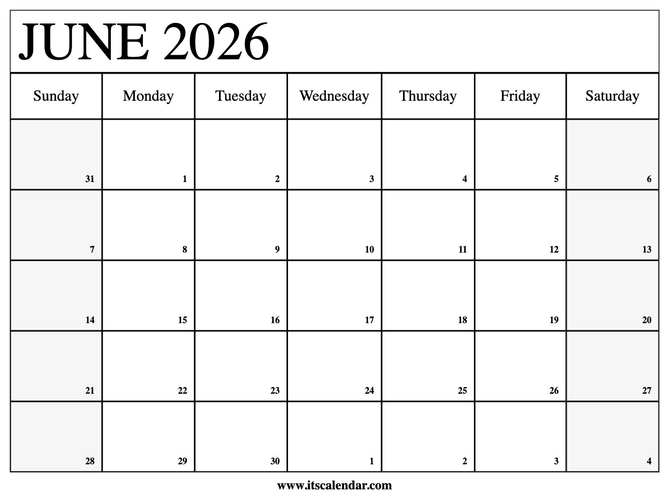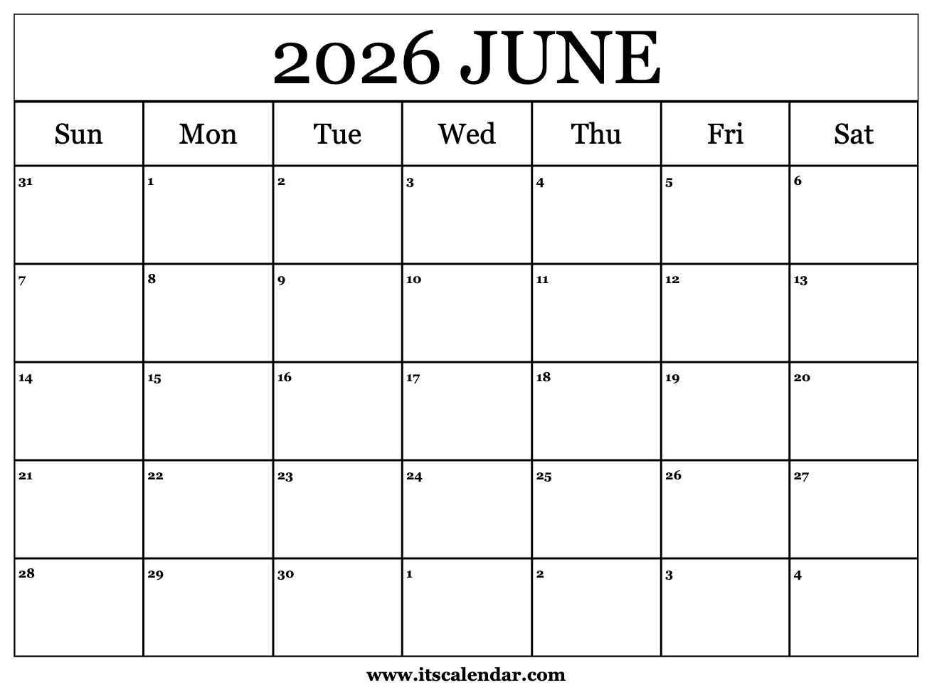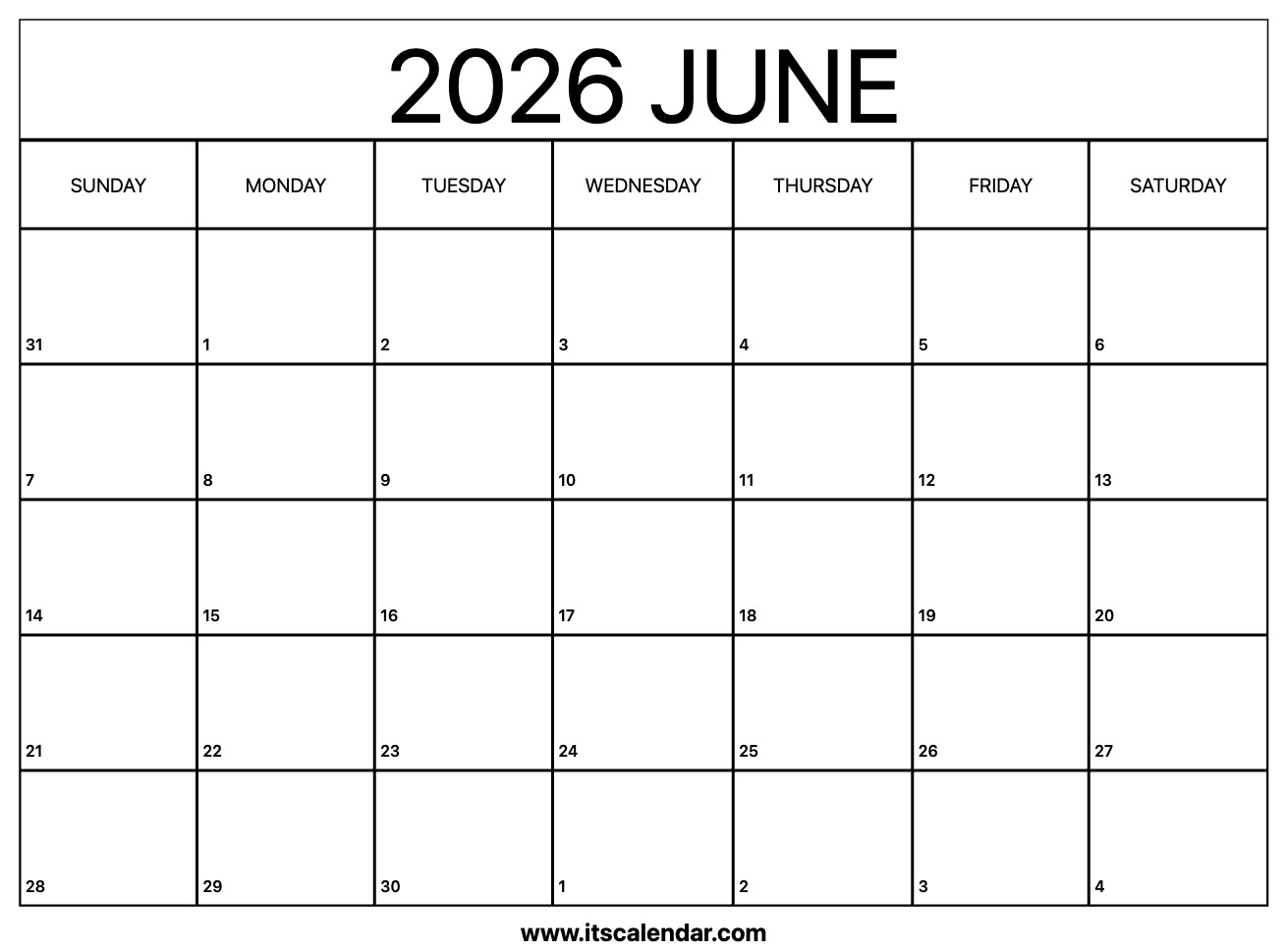 To make a good and effective plan for the whole month, it is enough to have a printable calendar with holidays. If you get a June 2026 calendar template, you can edit all of your daily activities in one page. You can fill the days with events, celebrations, activities and invitations to remember each of them easily with a blank June 2026 calendar. It is also very easy to plan your weekends and summer vacations with a June 2026 calendar with holidays.